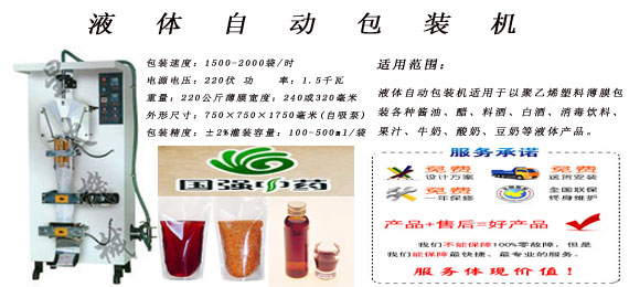 四川国强中药饮片有限公司是一家专业生产、销售中药饮片的医药企业。由于药品的包装生产需要,在资阳包装机生产厂家购买了液体自动包装机来进行药品的包装。这样的液体包装机是适用于以聚乙烯塑料薄膜包装各种酱油、醋、料酒、白酒、消毒饮料、果汁、牛奶、酸奶、豆奶等液体产品。其工艺流程部位全部采用不锈钢制成,符合食品医药行业卫标准要求。采用高位平衡罐或自吸泵定量充填,计量精确,包装精度高达±2%。直热封切,边封、背封式制袋封口方式,制袋尺寸、包装重量、封切温度调节方便可靠,色带打印生产日期。另光电跟踪功能保证制袋精确,封切准确。液体自动包装机采用自动化技术,可以包装不同规格的袋装液体产品,生产效率非常高,每小时可以包装1500-2000袋,操作方便,所包装产品美观大方,是目前市场上性价比较高的一款设备,被众多的液体包装生产企业所使用,是液体包装的很佳包装设备。